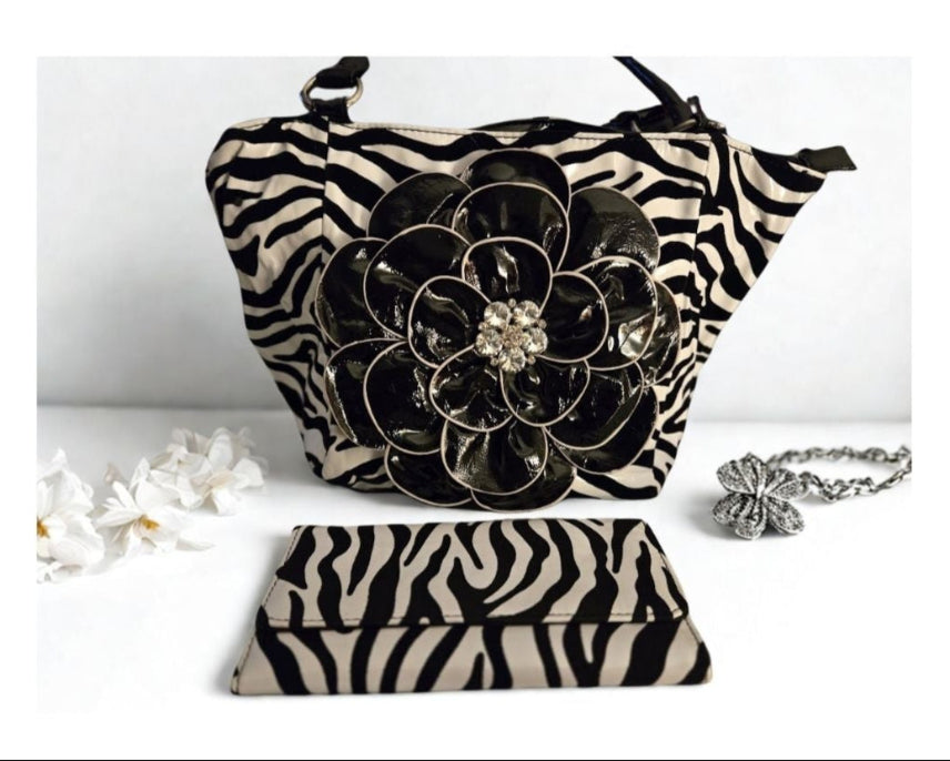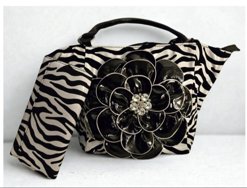 A Zebra Print Handbag w/ Decorative Black Flower & Matching Wallet